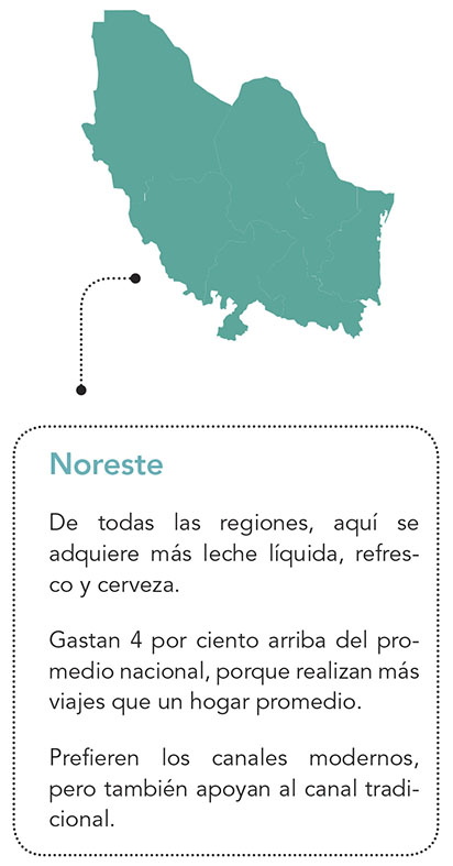 En el Noreste, también se reporta un gran desprendimiento económico, pues la zona ostenta un 4 por ciento arriba del promedio nacional y aunque prefieren los canales modernos, también apoyan al canal tradicional.