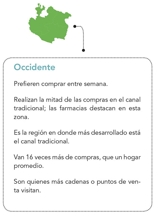 La investigación apunta que en el Occidente de México, las personas hacen la mitad de sus compras en el canal tradicional, que es donde ese sector está más desarrollado; de manera sorprendente las familias van 16 veces más de compras, que en un hogar promedio.
