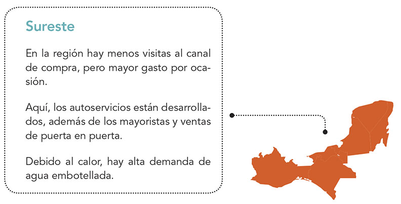 Asimismo en el Sureste, la firma de mercados indica que es la región con menos visitas al canal de compra, pero mayor gasto por ocasión; aunque los autoservicios y mayoristas están muy desarrollados.
