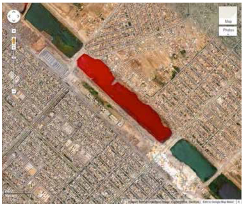 Según las imágenes de satélite de Google Earth en las afueras de la ciudad Sadr, en la República de Irak, se encuentra este “lago de sangre”. Un informante dijo al blog de tecnología Boing Boing que “un amigo le dijo” que los mataderos iraquíes a veces vierten la sangre en canales por eso el lago se ve así, sin embargo hasta hoy nadie ha ofrecido una explicación oficial. Lo más probable es que el color rojo viene de aguas residuales, contaminación o un proceso de purificación de agua.
