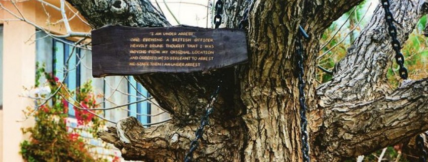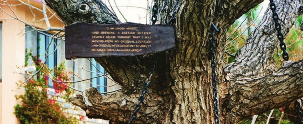 Hasta el día de hoy el prisionero está encadenado con un letrero colgado de sus ramas que dice: “Estoy detenido. Una noche, un oficial británico fuertemente borracho pensó que me estaba moviendo de mi ubicación original y ordenó al sargento que me arrestara. Desde entonces estoy detenido.