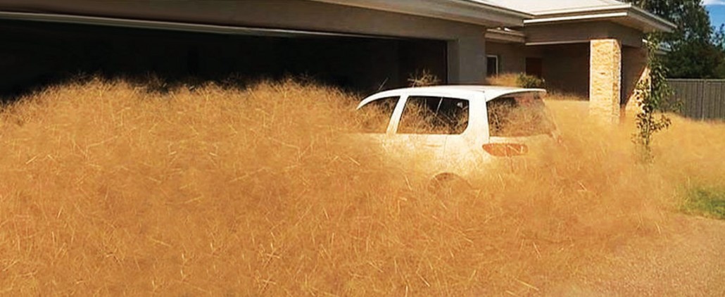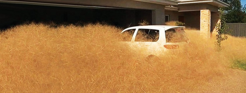 Los australianos la denominan “pánico peludo” –Panicum effusum– y es una maleza que se reproduce más rápido de lo que cuesta eliminarla: los residentes limpian por horas sus entradas, terrazas y patios, pero al día siguiente, la hierba mala está hasta el techo. Se trata de una especie nativa de Australia, que anualmente brota por todo el país; tiene pelillos largos en los bordes de sus hojas y puede crear nubes del desierto o norias –ovillos de hierba muerta diseñados para moverse y reproducirse–.
